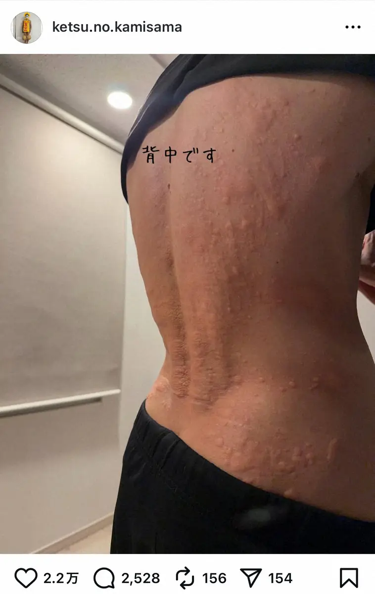 樽美酒は「これ酷い時の蕁麻疹です いつどのタイミングで出るのかわかりません、、これじゃあ服は脱げないなと思ってます笑」とつづり、背中一面に症状が出た写真を投稿。「とりあえず迷惑かける前にお伝えしておきます 気持ちが悪いとかなく、ただ痒くて眠れないみたいな感じです。運動は問題なくできてます」とするも、ファンからは心配の声が殺到。