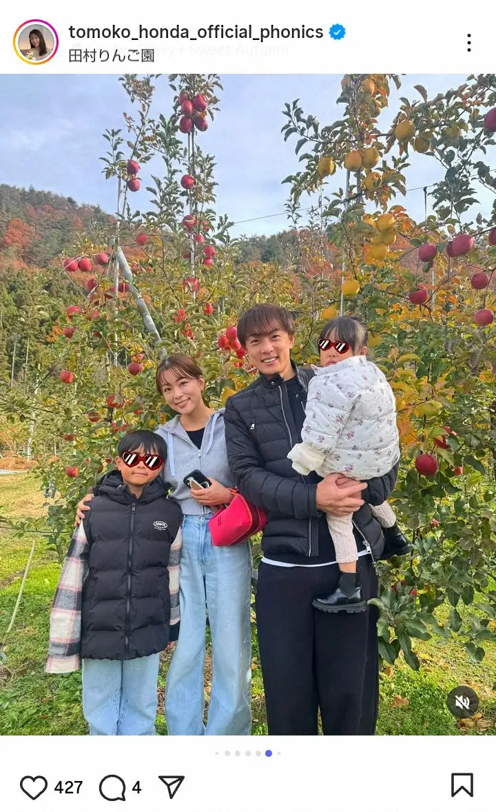 本田朋子 バスケ元日本代表イケメン夫&7歳長男&2歳長女と「初めての体験」りんご狩り家族ショット披露