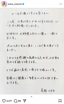 星南は「いつも応援して下さる皆さまへ」とし直筆の報告文を掲載。「この度、11月22日にかねてよりお付き合いしていた方と結婚いたしました」と伝えた。