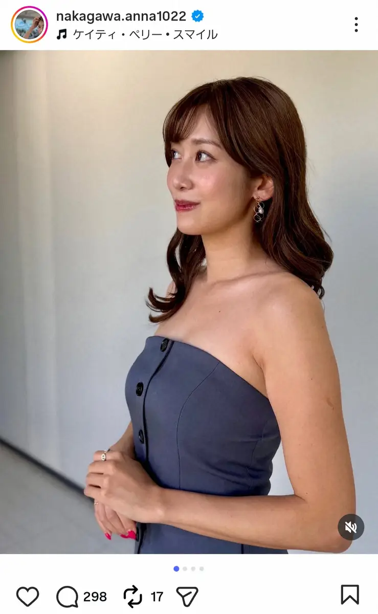 中川は「もうすぐ冬ですがチューブトップで失礼しますっ笑」と書き出し、グレーのチューブトップを身にまとった“美デコルテ衣装ショット”を披露した。