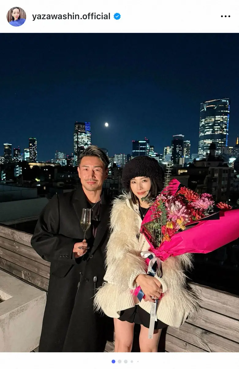 矢沢は「最近のあれこれ」として「いい夫婦の日を前にサプライズで用意してくれた花に感動」と夜景をバックに花束を手に魔裟斗との2ショットを投稿した。