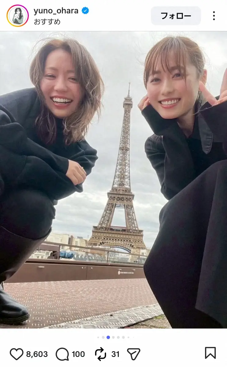 大原は「少し前のパリ旅行の思い出たち」と書き出し、フランス・パリの有名観光スポット「エッフェル塔」をバックに撮影した、女優の福原遥(27)との“パリ旅思い出2ショット”を披露。