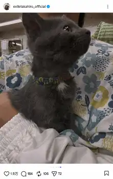 TAKAHIROは「NEKOHIRO氏」と書き出し、猫を抱き上げた写真をアップ。ハッシュタグで「赤影看板猫」「しょうがくん」「名付け親」「TAKAHIRO」「仮面のニャン者」「しょうがくん」「双子コーデ」と伝えた。