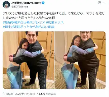 小手伸也 広瀬アリスと衝撃ハグショット、「触らない配慮」に絶賛の声「ステキ」「素晴らしい」