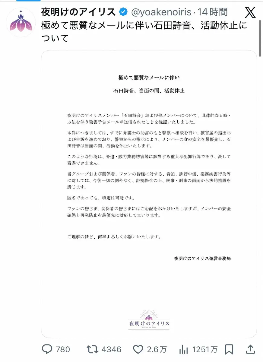 「極めて悪質なメールに伴い石田詩音、活動休止について」とつづり、文書を投稿。「夜明けのアイリスメンバー『石田詩音』および他メンバーについて、具体的な日時・方法を伴う殺害予告メールが送信されたことを確認いたしました」と明かし、「本件につきましては、すでに弁護士の助言のもと警察へ相談を行い、被害届の提出および告訴を進めており、警察からの指示により、メンバーの身の安全を最優先し、石田詩音は当面の間、活動を休止します」と報告した。