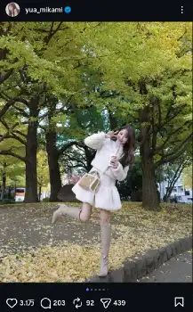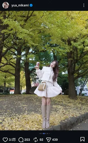 「銀杏ともギリギリ写真撮れた 12月も今年最後まで頑張ります セットアップは今週発売アイテム 展示会で1番人気だったアイテム」と、銀杏並木を背景にした白のミニスカ・セットアップ姿の写真をアップ。
