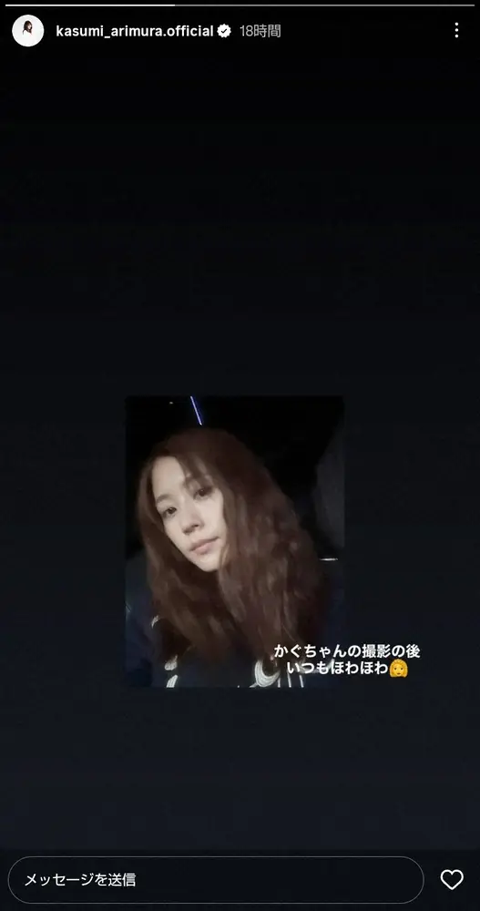 有村はストーリーズで「かぐちゃんの撮影の後」と投稿。「いつもほわほわ」と、ウエーブヘアになった自身の姿を公開した。