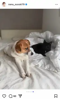 鈴木は「私のベッドの上にいつもモモちゃんとクロちゃんが一緒にいます」「私が寝る時も川の字でクロちゃん私モモちゃんで寝てるよ」とコメント。保護犬と保護猫だったという、愛犬と愛猫の姿を公開した。