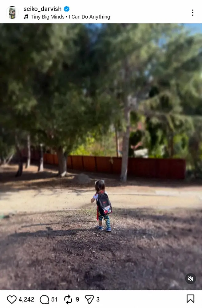 そして「まだ通い出したばかりだけど、今日のこの子の勇気が本当に素晴らしかった。この先また素敵なお友達が沢山できるといいね」と打ち明け、「こんな朝を迎えた私達でした。笑」と投稿。「写真は学校行ってない時の末っ子」とリュックを背に1人で歩く姿をアップした。