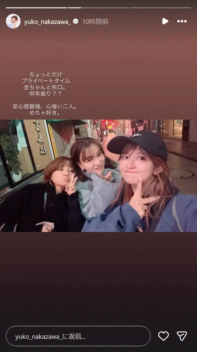 中澤はストーリーズに「ちょっとだけプライベートタイム。圭ちゃんと矢口。何年振り??」とつづり、保田圭、矢口真里との3ショットを投稿。「安心感最強、心強い二人。めちゃ好き」と再会を喜んだ。