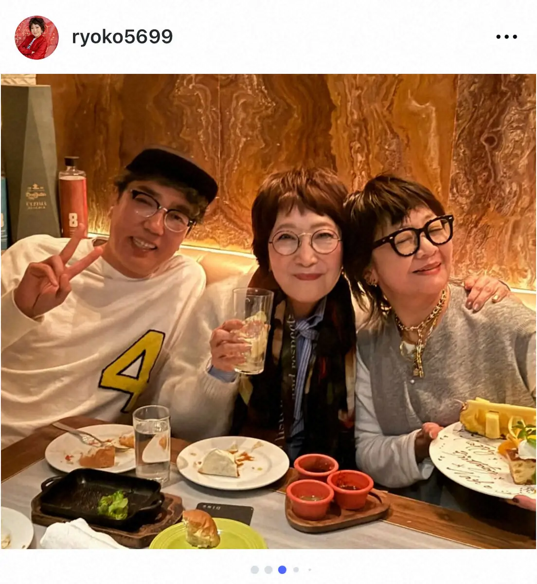 メキシコ料理店では「テキーラをかけて火をつけるお料理や珍しいもの色々」と明かし「帰りはエレベーターが開いたら鏡に映る3人、、、え?一斉にパシャパシャパシャ!自撮り、3人どり」と仲睦まじい3ショットも投稿した。