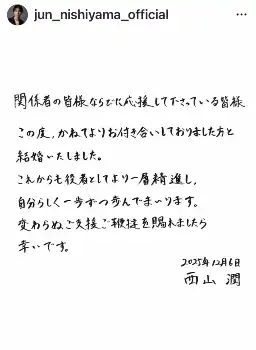 西山は「ご報告」として直筆メッセージを投稿。「関係者の皆様ならびに応援して下さっている皆様」として「この度、かねてよりお付き合いしておりました方と結婚いたしました」と結婚を報告した。