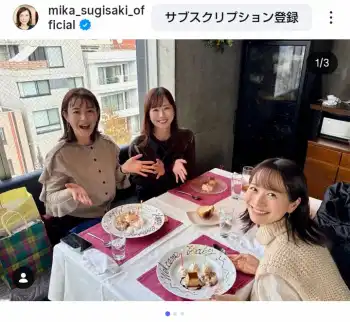 杉崎美香「いつもの3人」女子会ショット 第1子妊娠のアナの顔も…「幸せのお裾分け」「美人三姉妹」の声