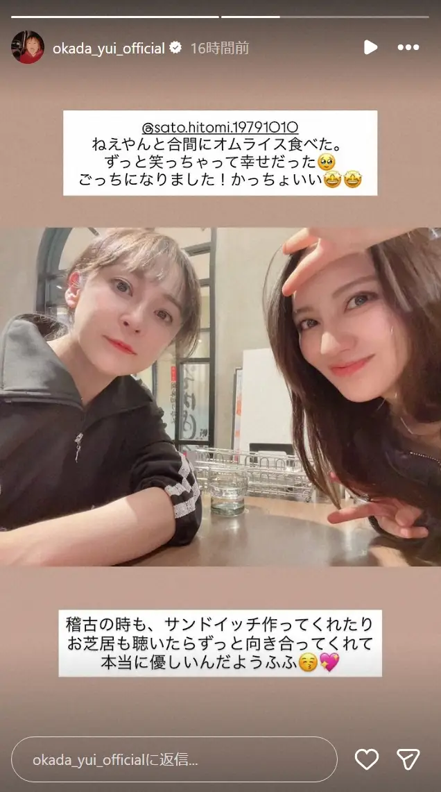 岡田はストーリーズに「ねえやんと合間にオムライス食べた。ずっと笑っちゃって幸せだった ごっちになりました!かっちょいい」とつづり、女優の佐藤仁美(46)との2ショットを投稿。