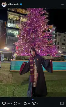 「ハリーポッターツリー点灯式トークショーの司会でした!」と点灯したツリーの前での、ハリー・ポッターのコスプレショットを公開した。