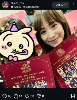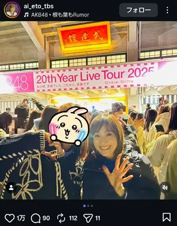 「KB48 20th Year Live Tour 2025 in日本武道館~あの頃、青春でした。これから、青春です~ 大学時代の友人と行ってきました」と、東京・武道館で開催されたAKB48の20周年記念コンサートに大学時代の友人とともに行ったことを報告。