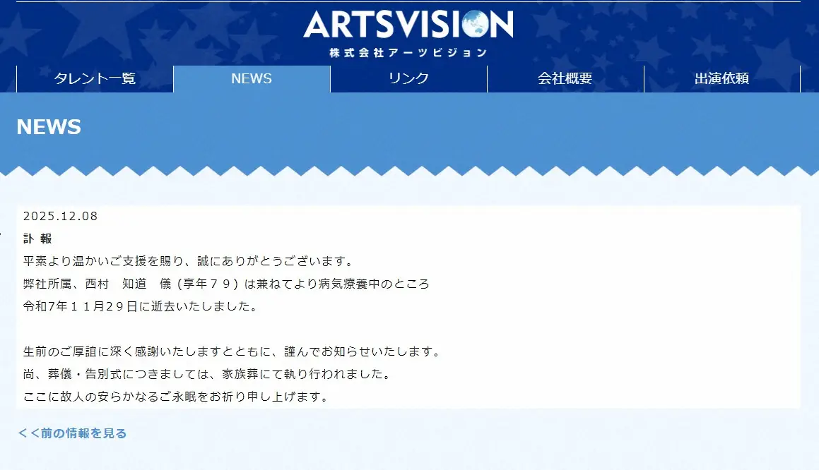 公式サイトでは「平素より温かいご支援を賜り、誠にありがとうございます。弊社所属、西村知道儀(享年79)は兼ねてより病気療養中のところ令和7年11月29日に逝去いたしました。生前のご厚誼に深く感謝いたしますとともに、謹んでお知らせいたします」と発表。葬儀、告別式は家族葬にて執り行われたとした。