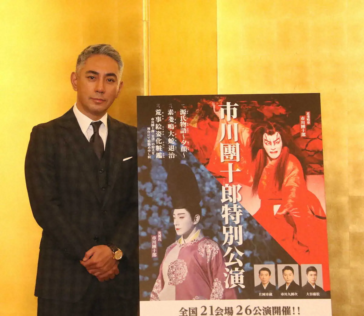 「源氏物語~夕顔~」「素戔嗚大蛇退治」「荒事絵姿化粧鑑」を上演する。源氏物語を演じるのは團十郎となってからは初。「話は何度かあったんだけど、たまたまなくて」と説明した。
