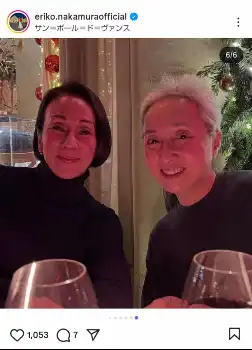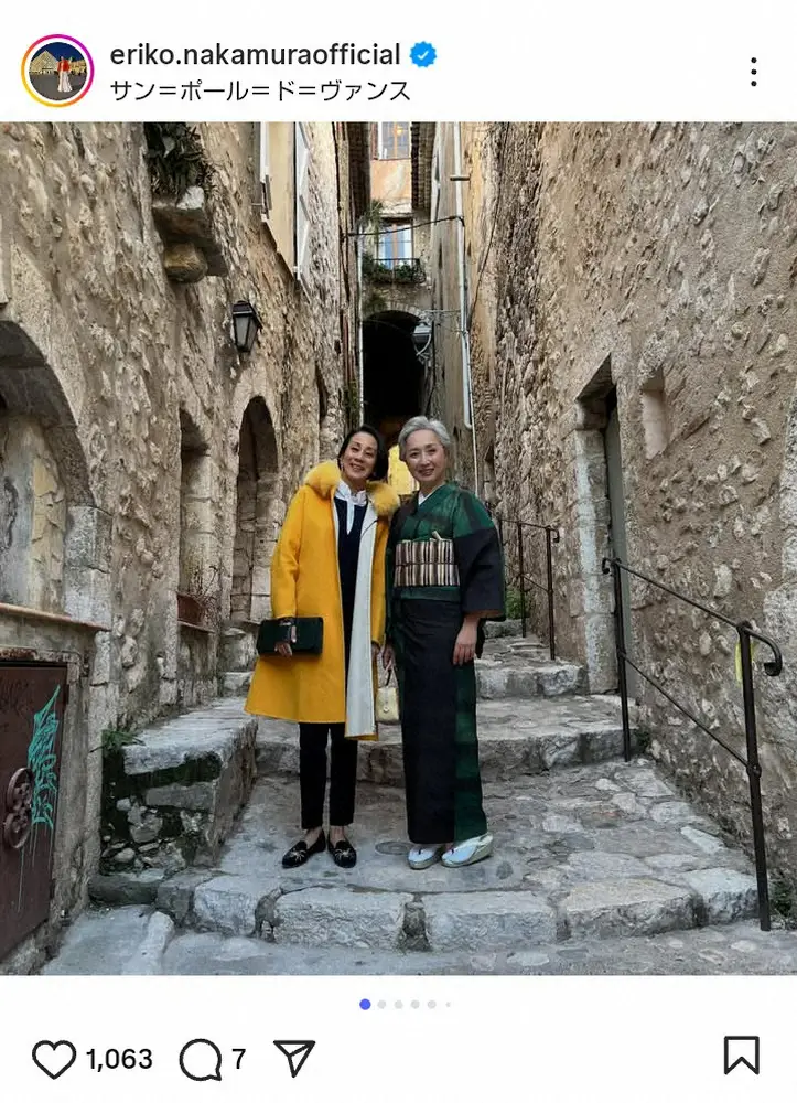 フランスのパリ在住だった中村は、夫の仕事の関係で今年の9月から1年間、イタリアのミラノに住むことになったが、この日は「大好きな仲間、尊敬する同期のサト @sato_greyhair が南仏の我が家へ」と南仏の街角での黄色のコート姿の自身と、緑の着物姿の近藤の2ショットをアップ。