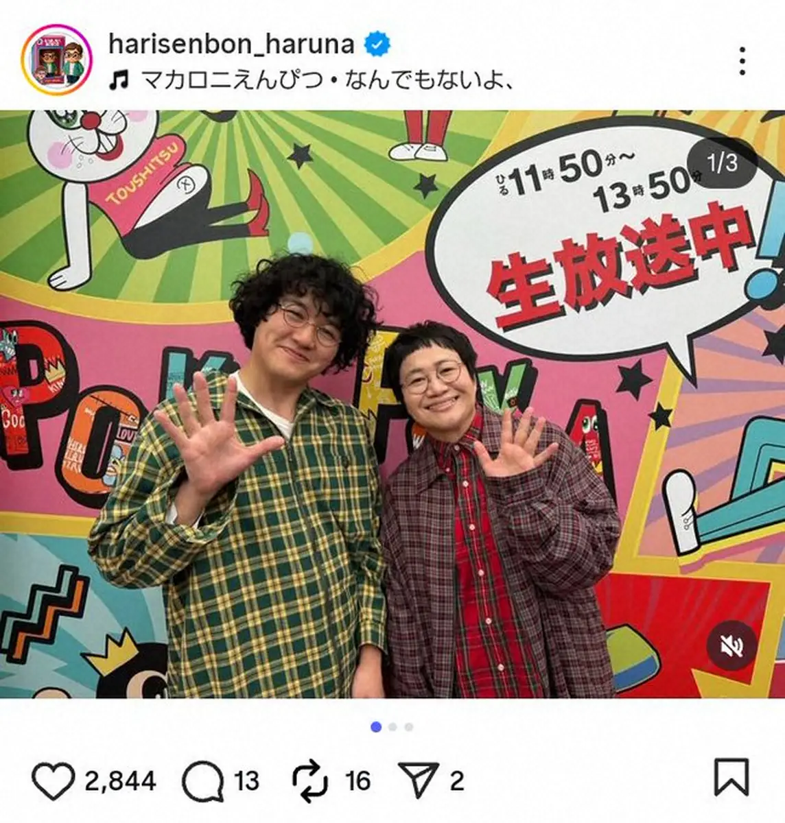 「ステラおばさんじゃねーよ!なふたり」と書きだした近藤。「マカロニえんぴつ長谷川大喜さんにお会いできましたよ」と報告し2ショットをアップした。