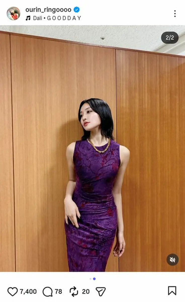 髪色を紹介しつつ、近影を公開。ボディラインがくっきりと出る、紫のタイトなドレス姿をアップした。