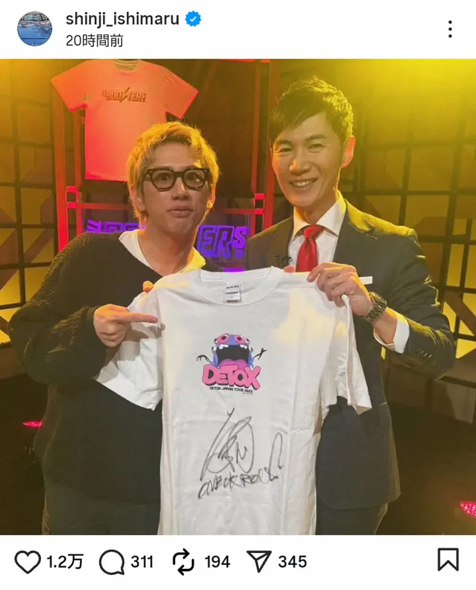 「2025年で1番目に記念すべき日になりました」とつづり、Takaとのツーショットを披露。石丸氏はサイン入りのワンオクのツアーTシャツを手に満面の笑みを浮かべている。「ご本人に確認しましたが、海外ツアー、日本から来て良いんですって笑」と続けた。