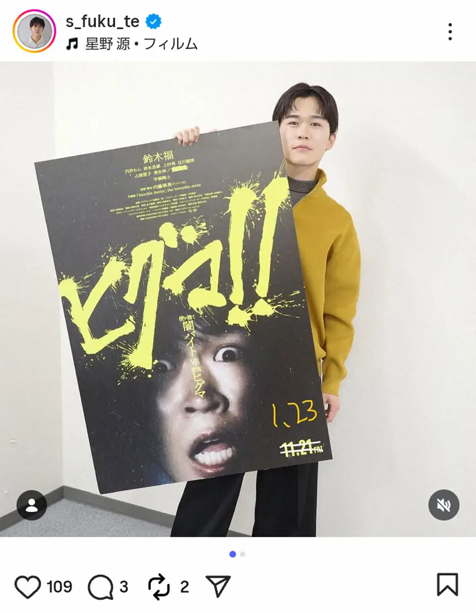 「映画『ヒグマ!!』2026年1月23日に公開が決定しました」とつづり、「今だからこそこの映画を受け取ってほしいです。ぜひ劇場でご覧ください!!」と呼びかけた。映画ポスターを手に持つ写真を披露し、公開日は手書きで1.23と修正されていた。