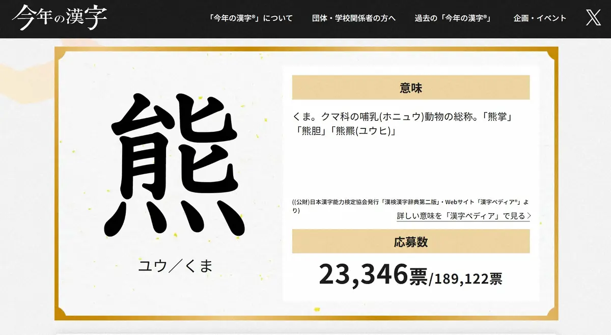 今年は全国各地でクマが生活圏に出没し、被害が相次いだ。また、和歌山県白浜町のレジャー施設「アドベンチャーワールド」のパンダ(熊猫)4頭が中国に返還された。「熊」が選ばれた理由について、日本漢字能力検定協会は「日本各地で“熊”が出没し、国民の関心と不安が集中した年」「“熊”猫(パンダ)が中国に返還」と説明した。