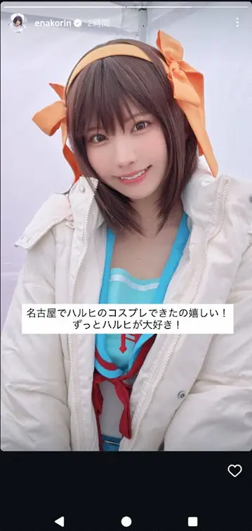 人気コスプレイヤーえなこが15日までに自身のインスタグラムのストーリーズを更新。人気アニメ「涼宮ハルヒの憂鬱」のキャラクター・涼宮ハルヒのコスプレを披露した。