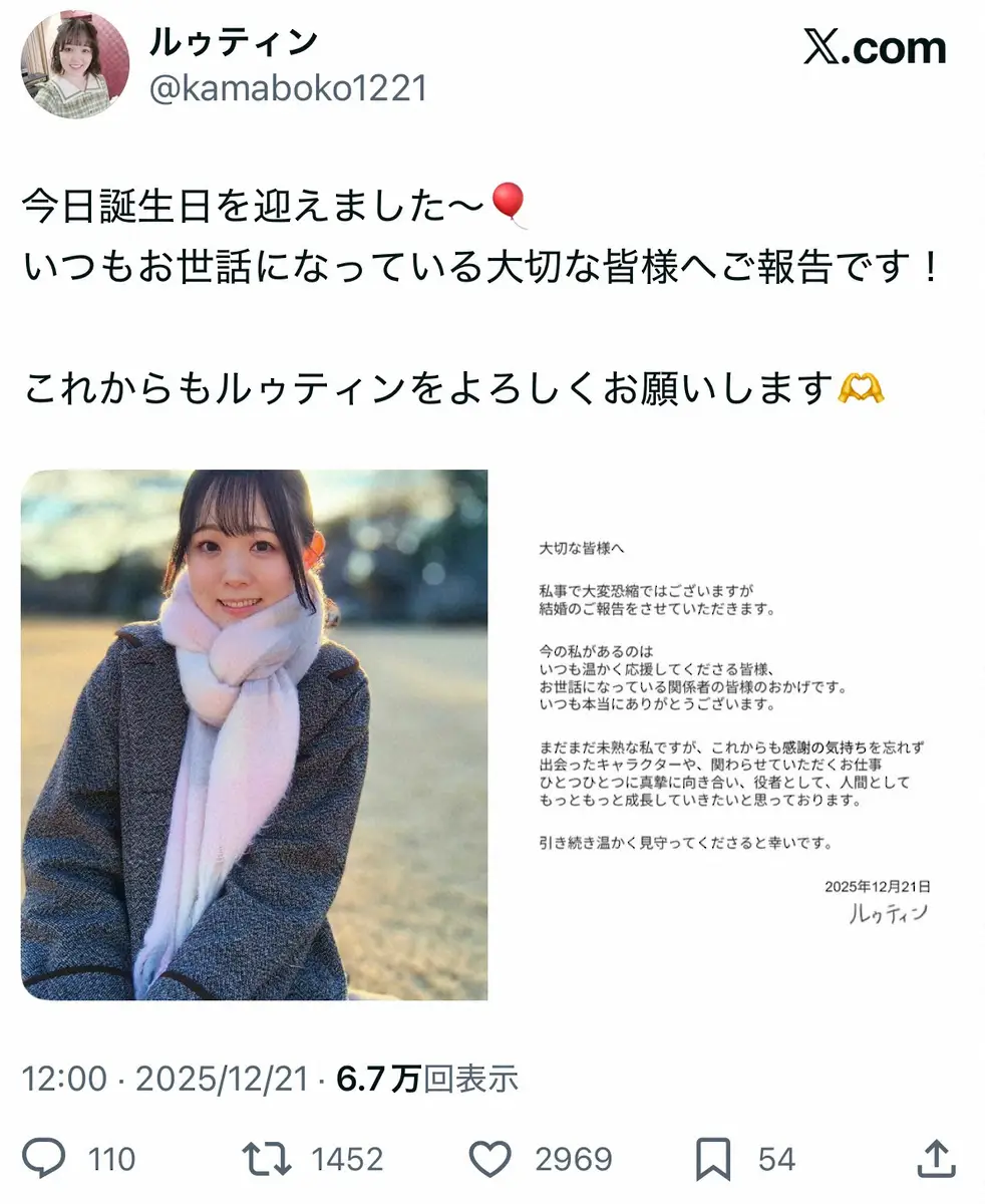 「アイドルマスター シンデレラガールズ」などで知られる声優のルゥティンが21日、自身のXを更新。32歳の誕生日を迎えたこの日に結婚を発表した。