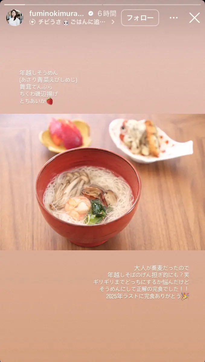 料理上手として知られており、日々の手料理を公開している木村。この日はストーリーズにて、「年越しそうめん(あさり青菜えびしめじ)、舞茸てんぷら、ちくわ磯辺揚げ、とちあいか」と記し、具だくさんの食卓を公開。