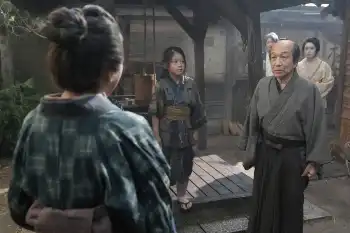 連続テレビ小説「ばけばけ」第68話。松野勘右衛門(小日向文世・中央)は上野タツ(朝加真由美・手前)にプロポーズし…(C)NHK
