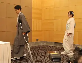 冒頭、淡いピンクの着物の松井とグレーの着物を着た辻本が金屏風の前に登場。12月の公演でかかとを骨折した辻本は松葉づえをもって姿を見せた。