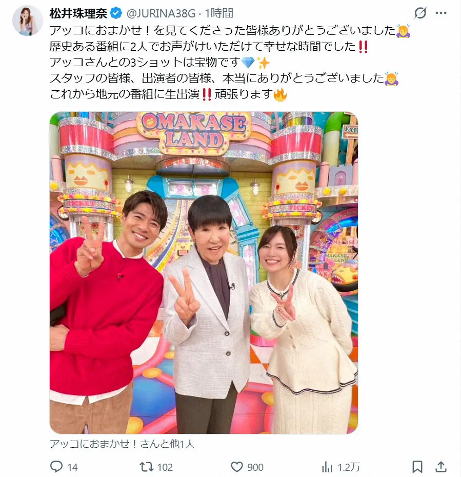 松井は「アッコにおまかせ!を見てくださった皆様ありがとうございました 歴史ある番組に2人でお声がけいただけて幸せな時間でした!!」と感激。「アッコさんとの3ショットは宝物です」とし、夫婦と同番組MCの和田アキ子との笑顔の3ショットを披露。