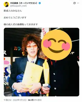 シンガー・ソングライターの大石昌良(オーイシマサヨシ、46)が12日、自身のXを更新。成人の日にちなみ、自身の成人式での写真を公開した。