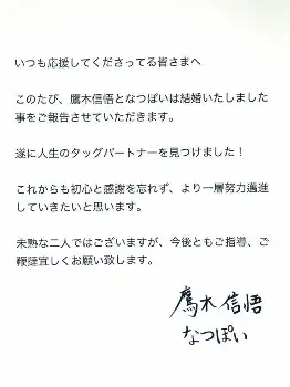 2人の連名で「このたび、鷹木信悟となつぽいは結婚いたしましたことをご報告させていただきます。遂に人生のタッグパートナーを見つけました!」とつづった。