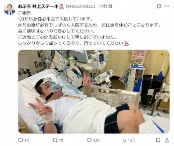 「おふろ」井上ステーキのX(@Hitoshi09111)から 34歳・吉本芸人 急性心不全で入院していることを報告 治療継続でしばら… ギャラリーで見る この記事のフォト 2026年01月14日の画像一覧 もっと見る 2026年01月14日の画像をもっと見る