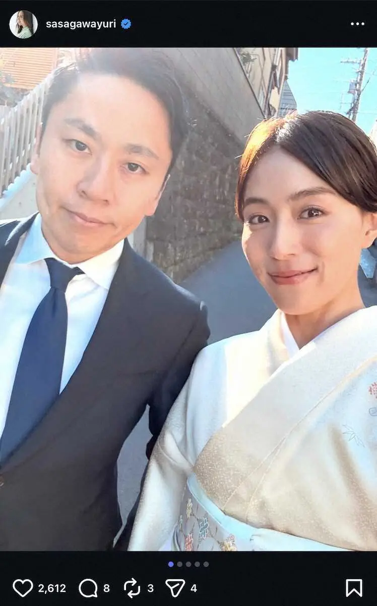 TBSアナウンサーで起業家・フリーアナウンサーの笹川友里(35)が16日までに自身のインスタグラムを更新。新春の仲睦まじい夫婦2ショットを投稿した。