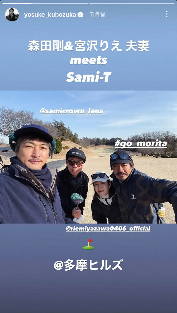 「森田剛&宮沢りえ夫妻 meets Sami-T @多摩ヒルズ」とつづり、ゴルフ場での4ショットを公開。DJなどとして活動するSami-T、仲睦まじく寄り添う森田と宮沢、窪塚が収められた一枚になっている。