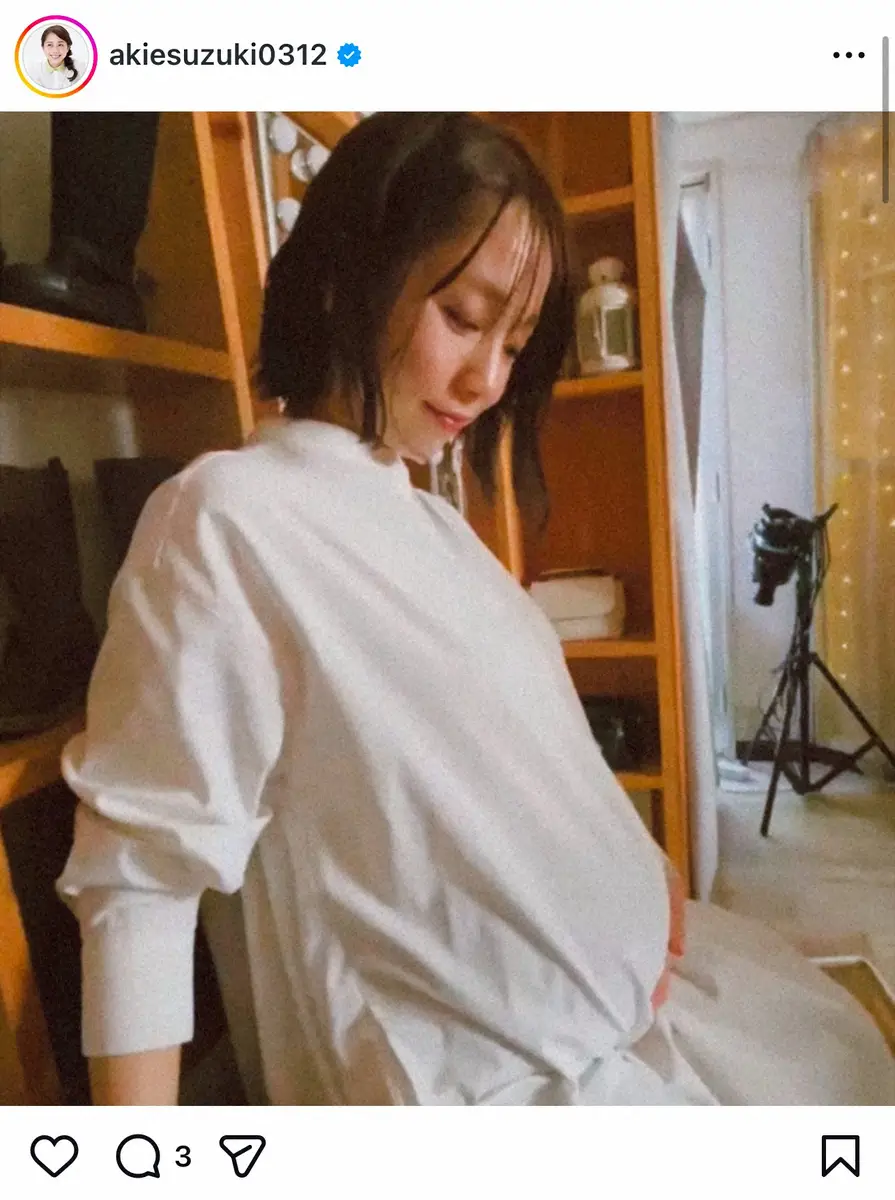 昨年9月に第3子の妊娠を発表した鈴木。この日は大きなおなかに手を添えたショットとともに「気付けば臨月 ここまで母子無事にこれたことに赤ちゃんと周りの環境に感謝ですね」と報告。