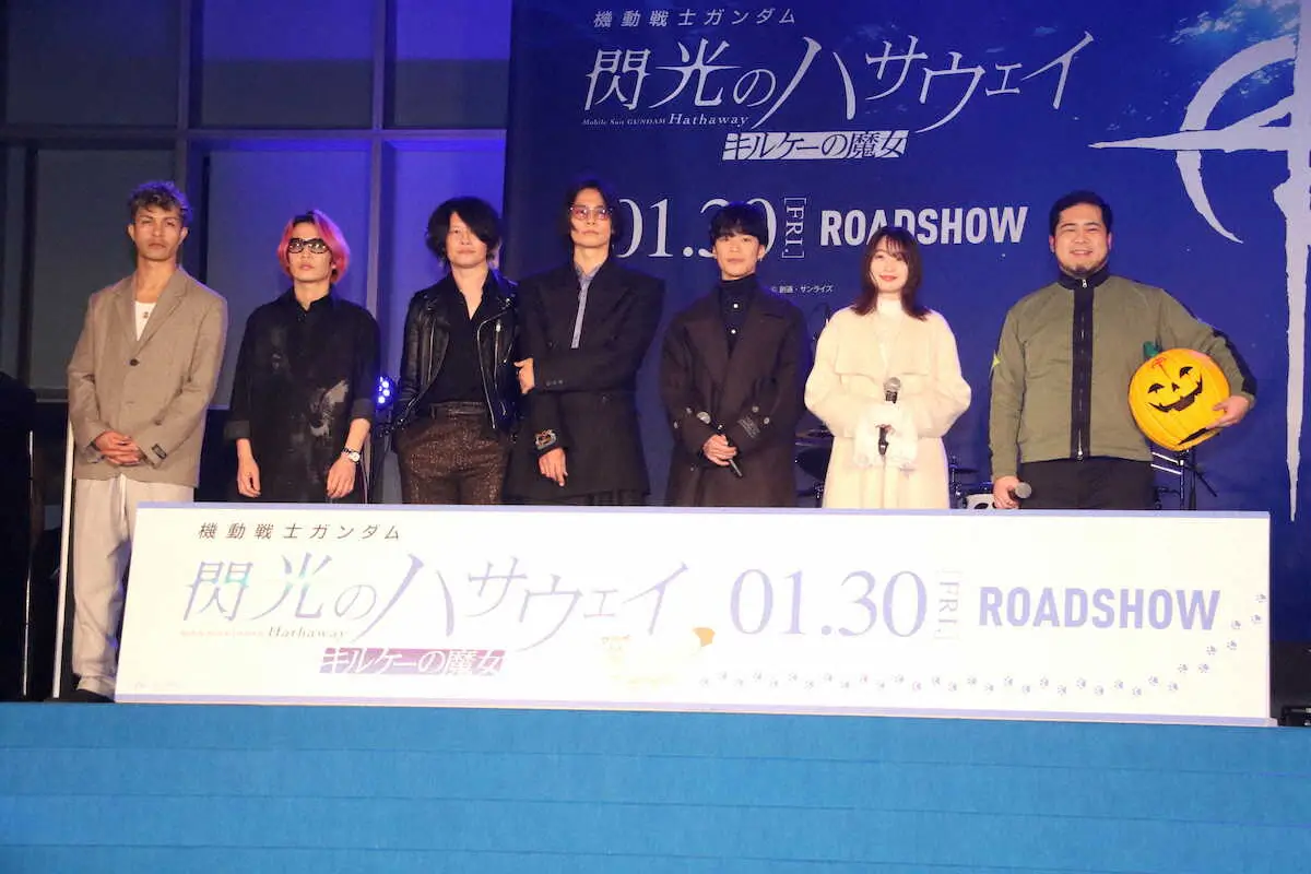 4人組ロックバンド「[Alexandros](アレキサンドロス)」が18日、東京・新宿の歌舞伎町シネシティ広場で映画「機動戦士ガンダム 閃光のハサウェイ キルケーの魔女」(30日公開、監督村瀬修功)の公開直前決起集会に出席した。