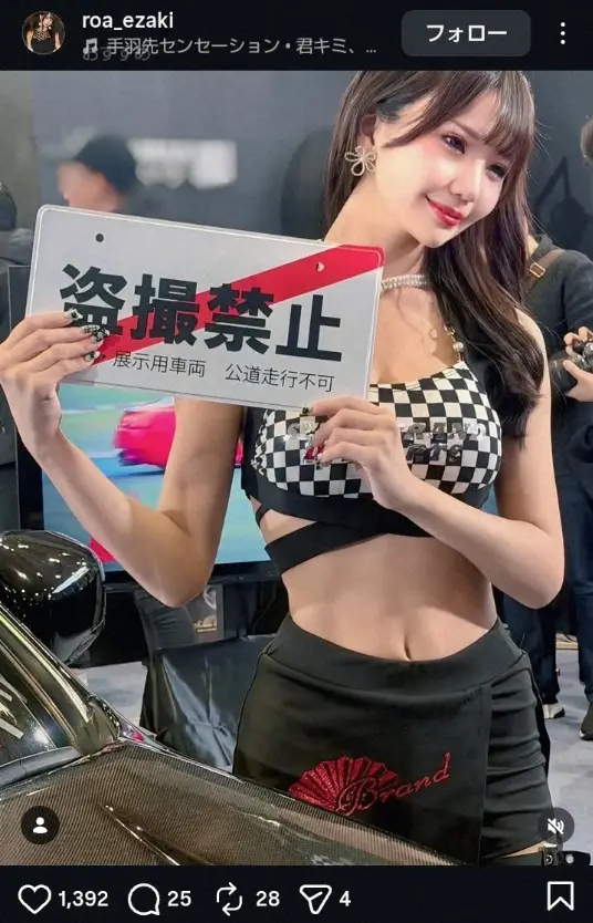 荏崎ろあ公式インスタグラム(@roa_ezaki)から レースクイーン・荏崎ろあ “盗撮禁止”アピール写真披露し「センスさんの… ギャラリーで見る この記事のフォト 2026年01月19日の画像一覧 もっと見る 2026年01月19日の画像をもっと見る