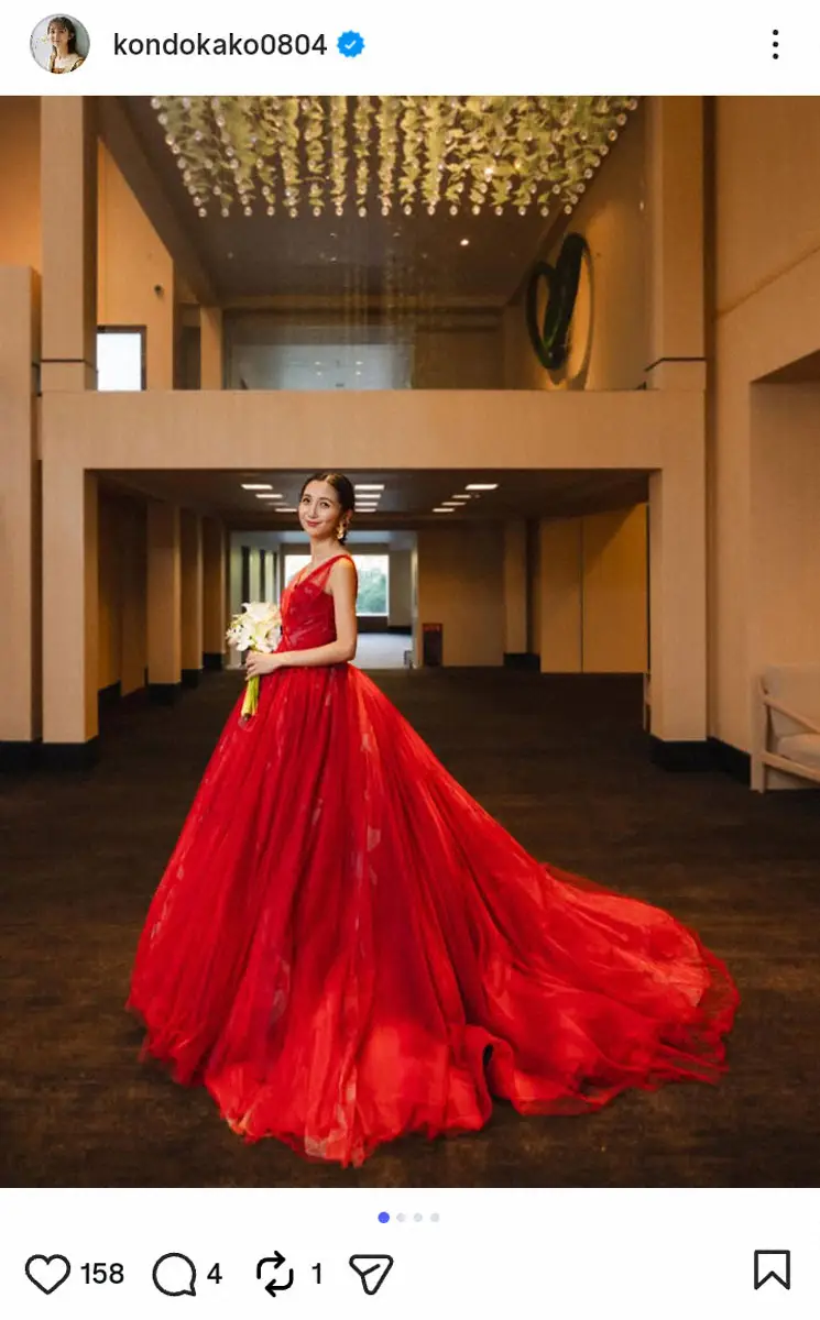19日までの投稿で昨年結婚式を行い、ウエディングドレス姿を披露していた近藤アナ。「お色直しは真っ赤なドレス」と赤のドレス姿を披露した。