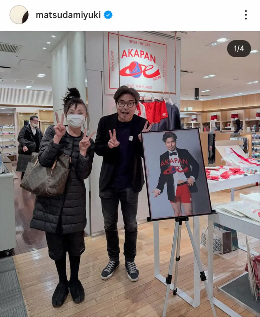 また「小澤さんのお父様は、指揮者で有名な小澤征爾さんですが、そのお父さんがいつも赤いパンツを履いていたらしく。二代揃って赤いパンツが好きなそうで(笑)だったら、販売しちゃおうって言うことになったらしいです!小澤征悦さんは。海洋問題にも取り組んでるらしく。いろいろ頑張ってる!」と、小澤征悦がディレクターを務めるアパレルブランド「アカパン(AKAPAN)」の売り場にいた小澤との2ショットを投稿し「みなさま!赤いパンツ!!履いてくださいね。わたしもプレゼントに買いました!行ってみてねー!」と続けた・