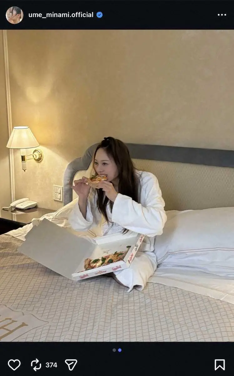 乃木坂46の梅澤美波(27)が21日までに自身のインスタグラムを更新。ベッドの上でピザを頬張るショットを公開した。