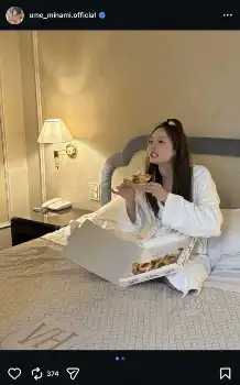 そして写真ではバスローブ姿で、ベッドの上でピザを頬張るショットを投稿した。