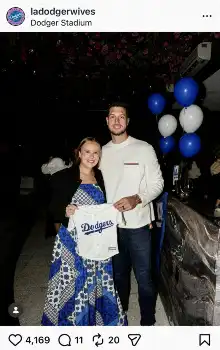 サマンサ夫人は現在、妊娠中で小さなドジャースユニホームを手にドジャーブルーのドレスに身を包み、タッカーと仲良く微笑む2ショット写真が夫人会によって公開された。