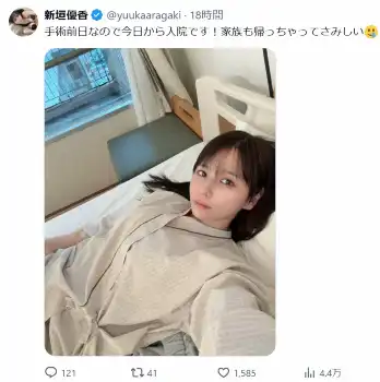 グラビアアイドルの新垣優香(32)が22日までに自身のXを更新。手術のため、入院したことを明かした。