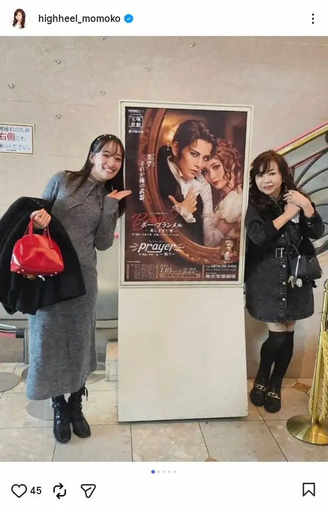 モモコは「東京へ宝塚歌劇雪組を観に行きました」と書き出し、「知ってる子が出てるだけで嬉しい」と、現在公演中の舞台「ボー・ブランメル~美しすぎた男~」「Prayer~祈り~」を鑑賞したことを明かした。