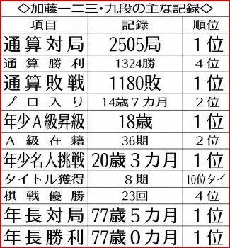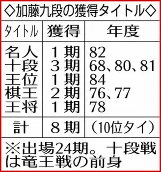加藤九段の獲得タイトル Photo by スポニチ 加藤一二三さん死去 86歳 77歳5カ月まで現役 医師も驚く「驚異の生命力… ギャラリーで見る この記事のフォト 2026年01月23日の画像一覧 もっと見る 2026年01月23日の画像をもっと見る